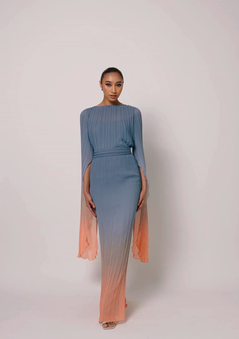 A boat-neckline top with long cape sleeves, paired with a column skirt featuring a wide pleated waistband.