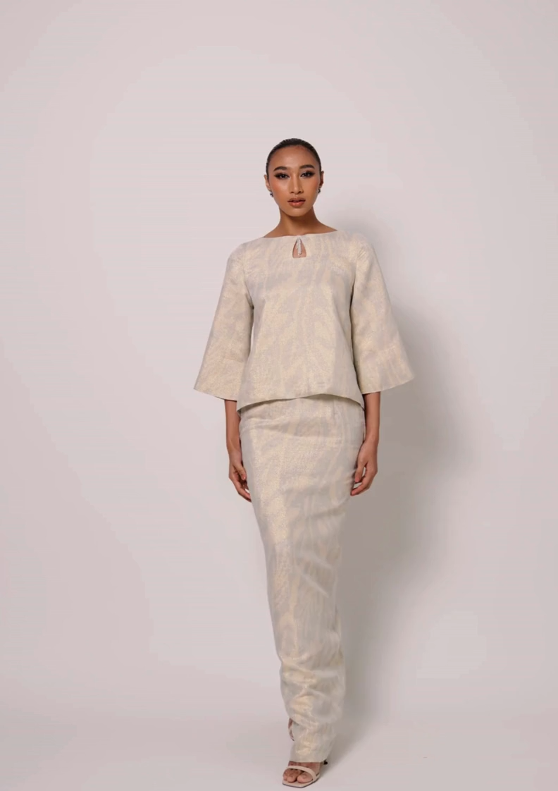 A ‘Kurung Kedah’ top with an embellished keyhole neckline, paired with a full-length column skirt finished with a back slit.