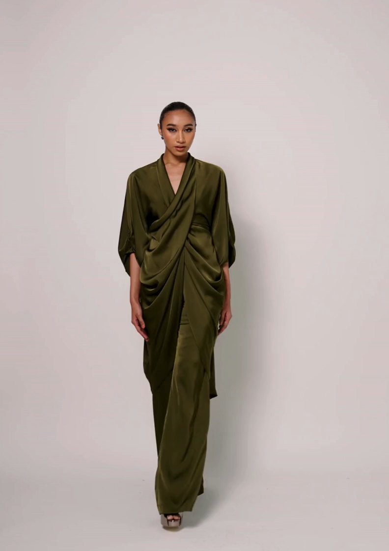 A draped front high-low top with raised sleeves and subtle embellishments, paired with straight-cut trousers finished with pockets.