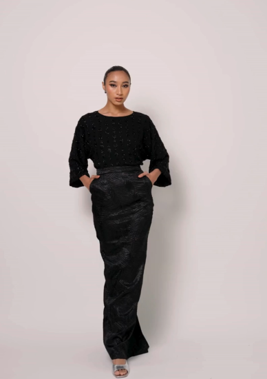 A ‘Kurung Kedah’ top, paired with a high-waisted column skirt finished with pockets.