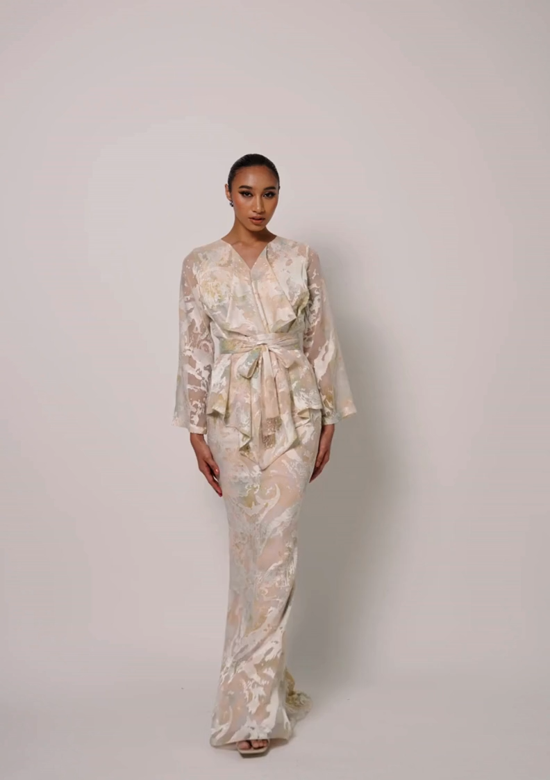 The signature wrap top with an attached embellished sash, paired with a full-length fit-to-flare skirt.
